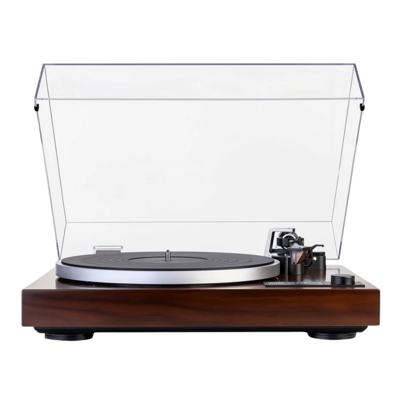 La meccanica adotta un motore DC con trazione a cinghia regolata e controllo ottico della velocità per una rotazione stabile e pulita. Il plinto in MDF con costruzione sub-chassis e smorzamenti in gomma aiuta a ridurre vibrazioni e risonanze, mentre il piatto in alluminio pressofuso con tappetino in gomma contribuisce a un appoggio più controllato del vinile. Disponibile in finitura Black o Walnut.